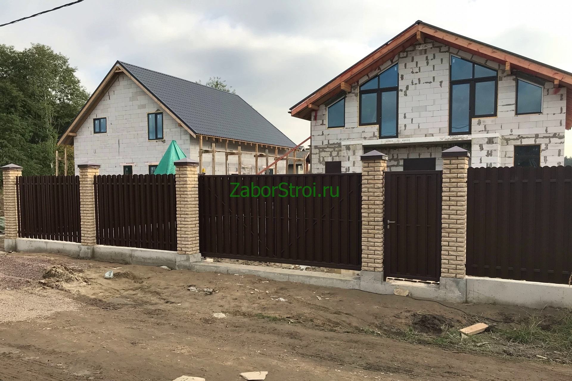 Заборы из евроштакетника с кирпичными столбами пример 9
